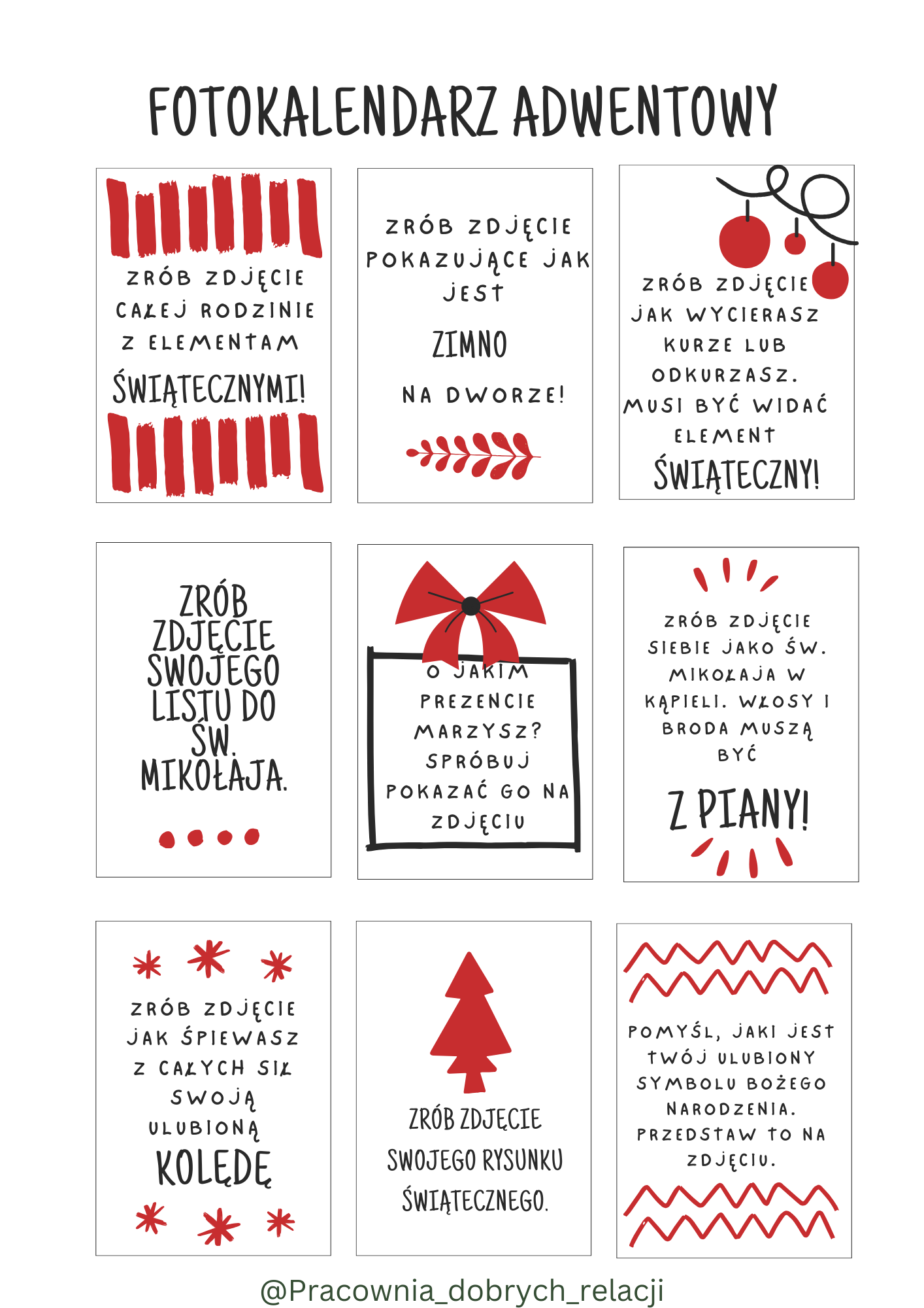 •Foto kalendarz adwentowy To Kalendarz Adwentowy na opak! Zamiast prezentu (lub oprócz, jeśli wolisz), dostajecie fotowyzwanie- inne na każdy dzień!